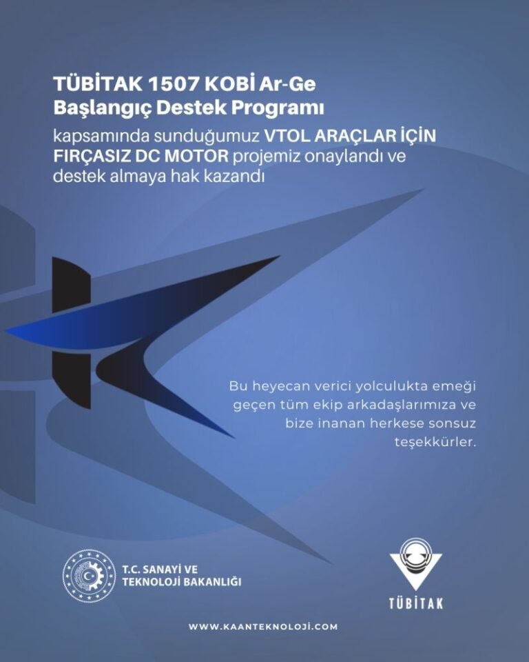 TÜBİTAK 1507 KOBİ Ar-Ge Başlangıç Destek Programı kapsamında sunulan VTOL araçlar için BLDC motor geliştirme projemiz destek almaya hak kazandı. Proje ile yerli ve özgün motor tasarımı, VTOL platformlara özel yüksek verimli tahrik çözümleri ve savunma-havacılık alanında dışa bağımlılığı azaltacak Ar-Ge çalışmaları hedeflenmektedir.